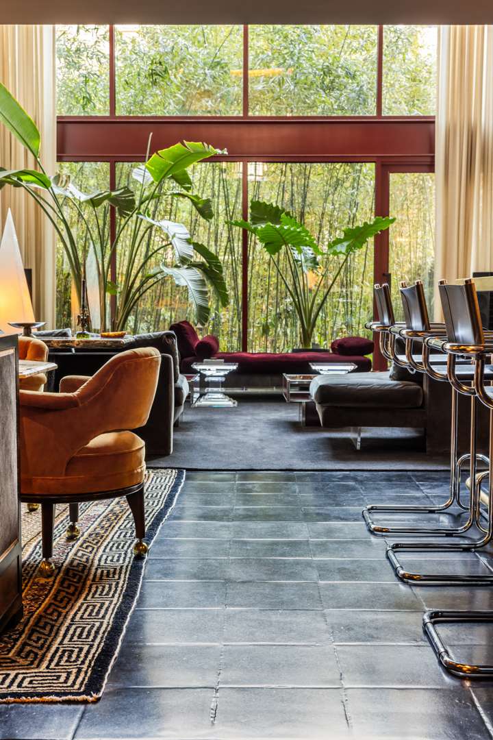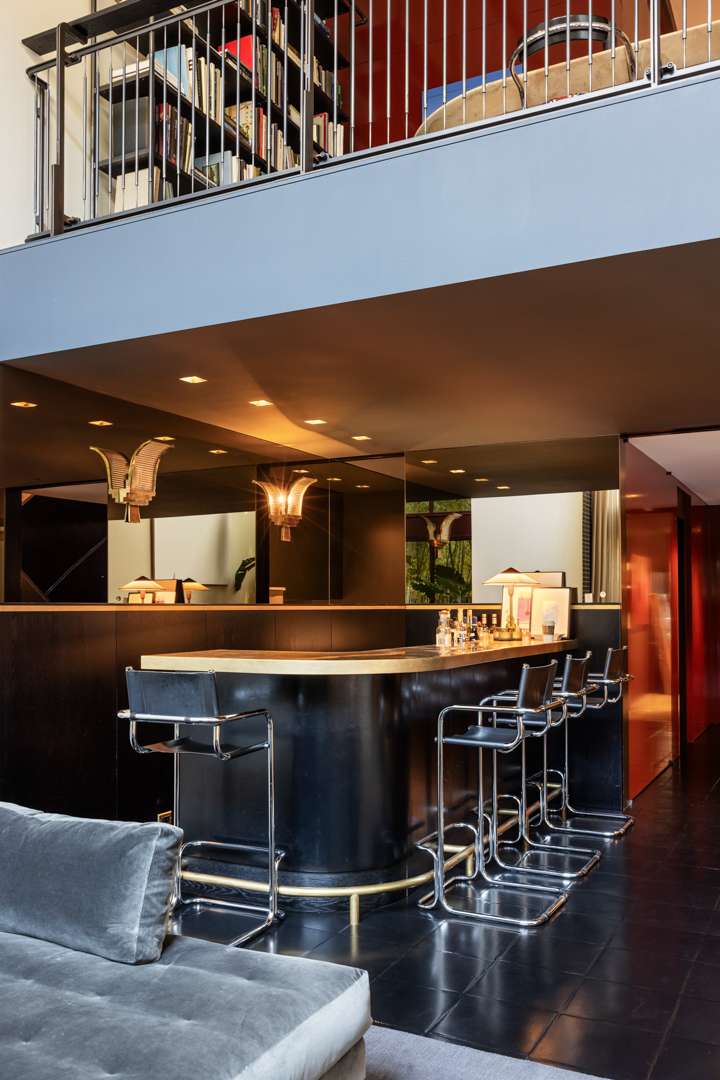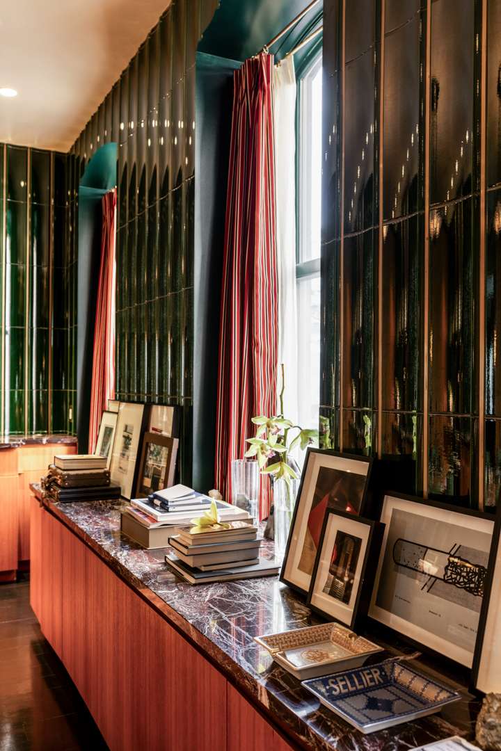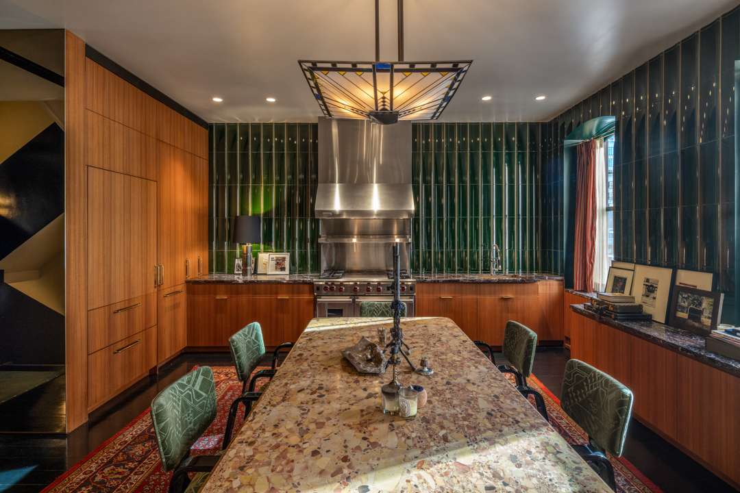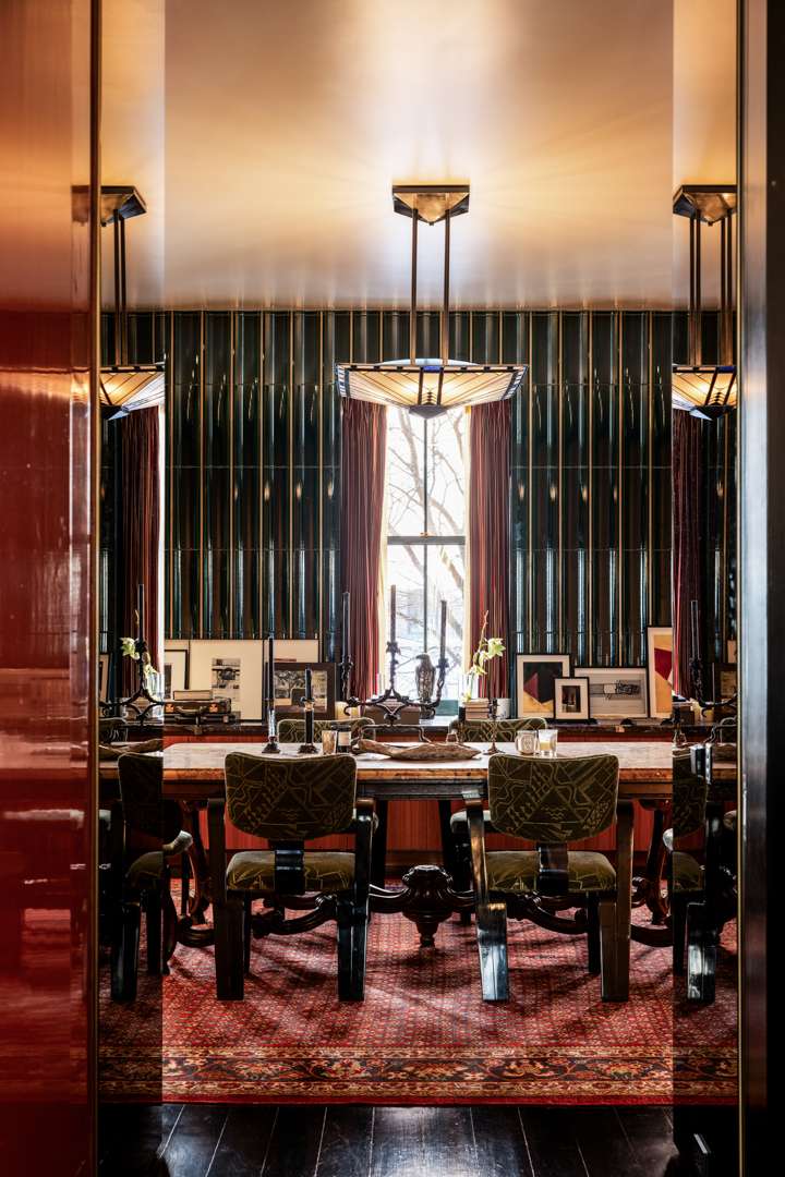 The design was inspired by creatives like surrealist filmmaker David Lynch and maximalist designer Lorenzo Mongiardino. “I think it’s about emotion and storytelling, and putting that into a white-box town house was the goal,” Haslam told AD. Dramatic architectural details and luxe materials fill the home—from black epoxy-sealed terracotta pavers in the entryway to 20-foot, floor-to-ceiling windows in the living room. The wood-clad kitchen, which look and lives more like a formal dining room with a kitchen on the side, is just one example of the home’s new, unique edge.