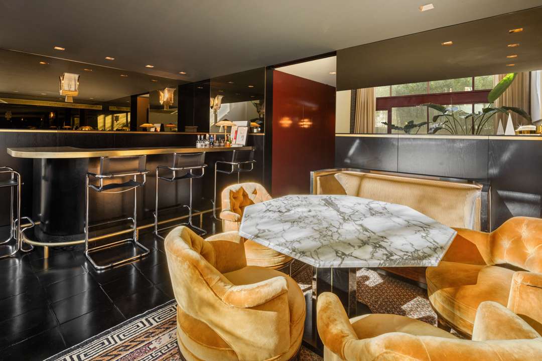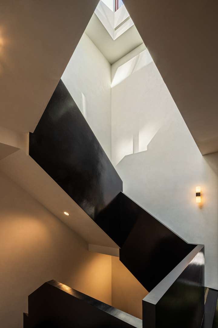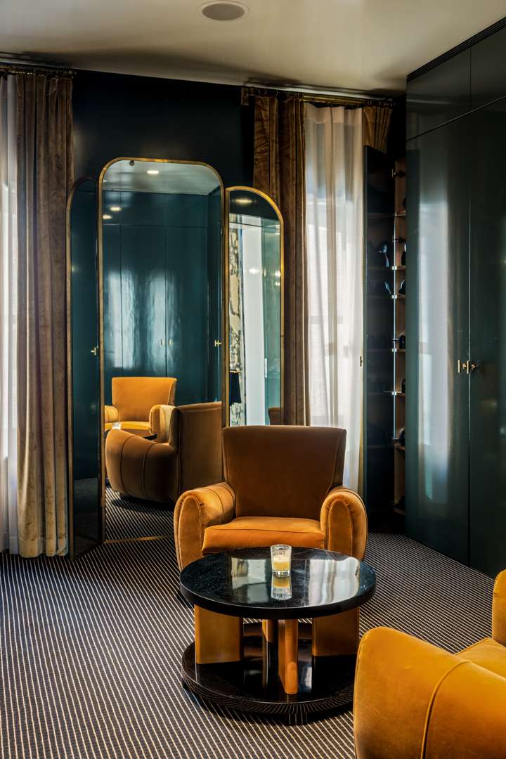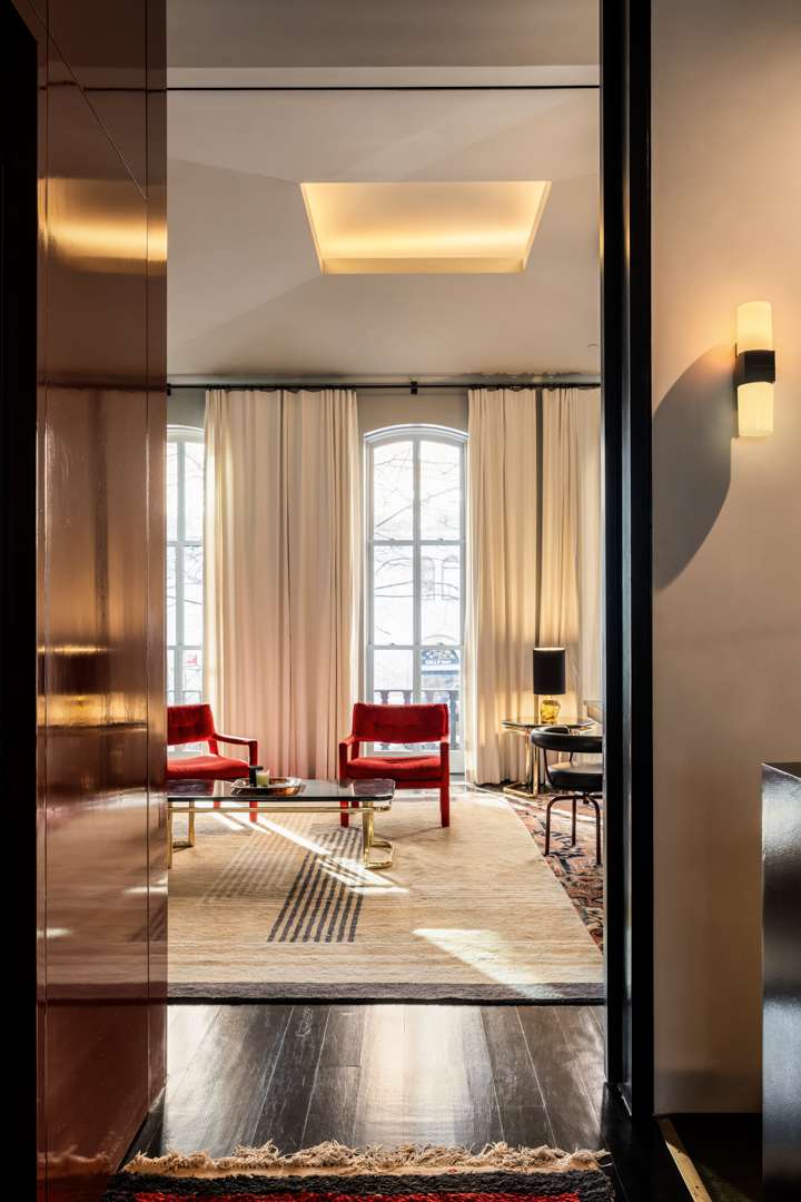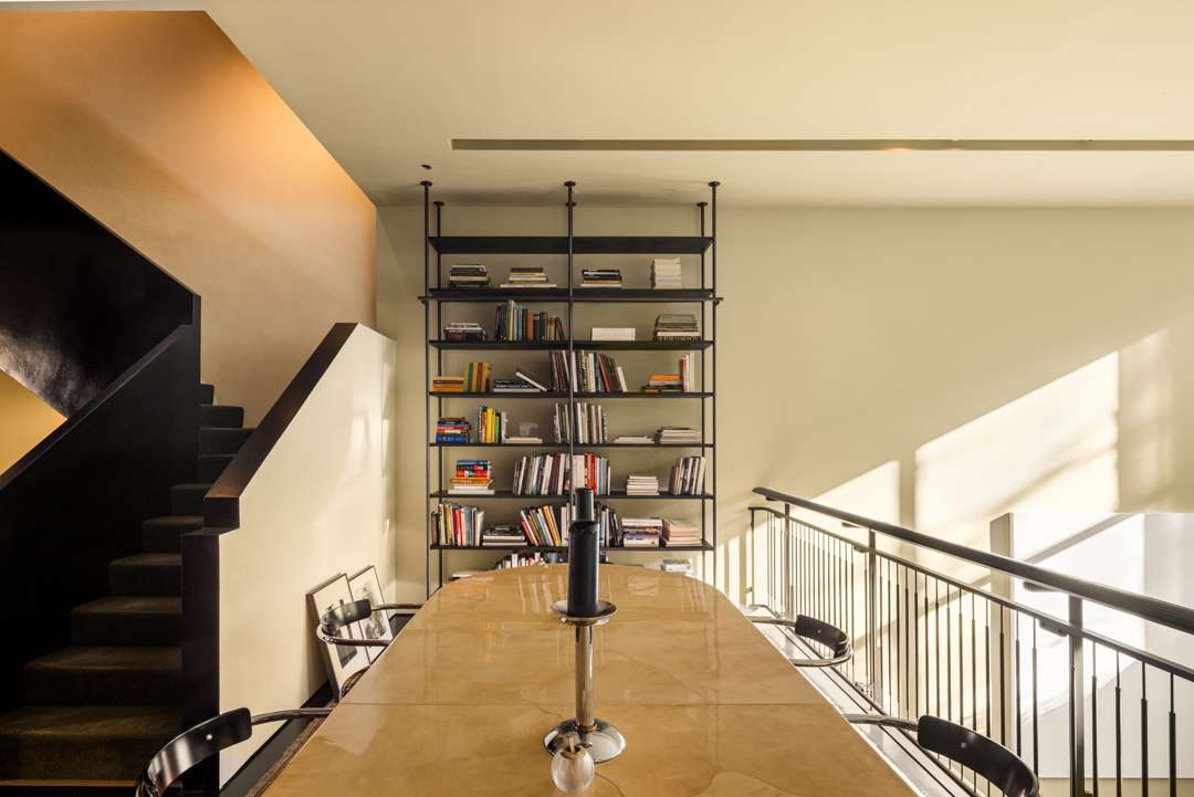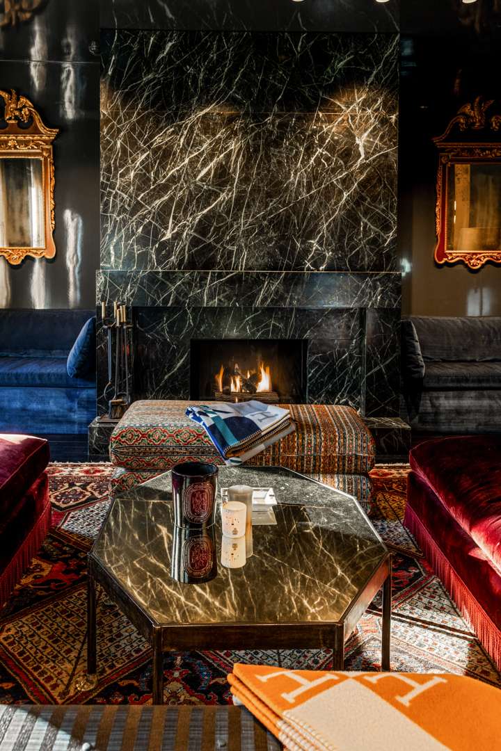 The design was inspired by creatives like surrealist filmmaker David Lynch and maximalist designer Lorenzo Mongiardino. “I think it’s about emotion and storytelling, and putting that into a white-box town house was the goal,” Haslam told AD. Dramatic architectural details and luxe materials fill the home—from black epoxy-sealed terracotta pavers in the entryway to 20-foot, floor-to-ceiling windows in the living room. The wood-clad kitchen, which look and lives more like a formal dining room with a kitchen on the side, is just one example of the home’s new, unique edge.