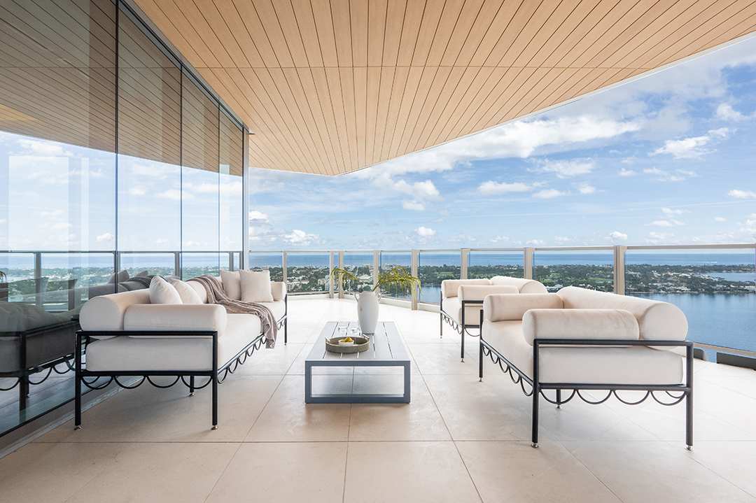 This four-bedroom, five-bathroom unit spans 4,400 square feet on the 22nd floor and is listed for $14,675,000. Wrap-around terraces overlook the Intracoastal Waterway, Worth Avenue, and the Atlantic beyond. The light and airy design is complete with a palette primarily of whites and beiges with warm wood accents, and sculptural lighting makes waves in many of the spaces.