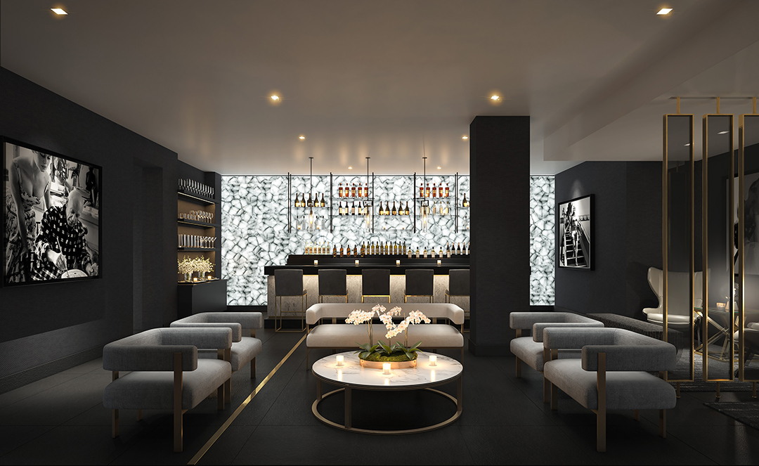 The lounge will also feature more than 20 kinds of tile and stone including lapitec polare bianco vesuvio, myorca linen limestone, and gray tundra marble. The space also includes Pure lights by Porsche Design Studio, custom glass dividers by Bendheim, a 14-foot absolute black marble custom bar with a two-inch bronze strip that creates a contiguous line down the bar, across the floor, up and down the double facing fireplace, through to the lobby and out the front door.