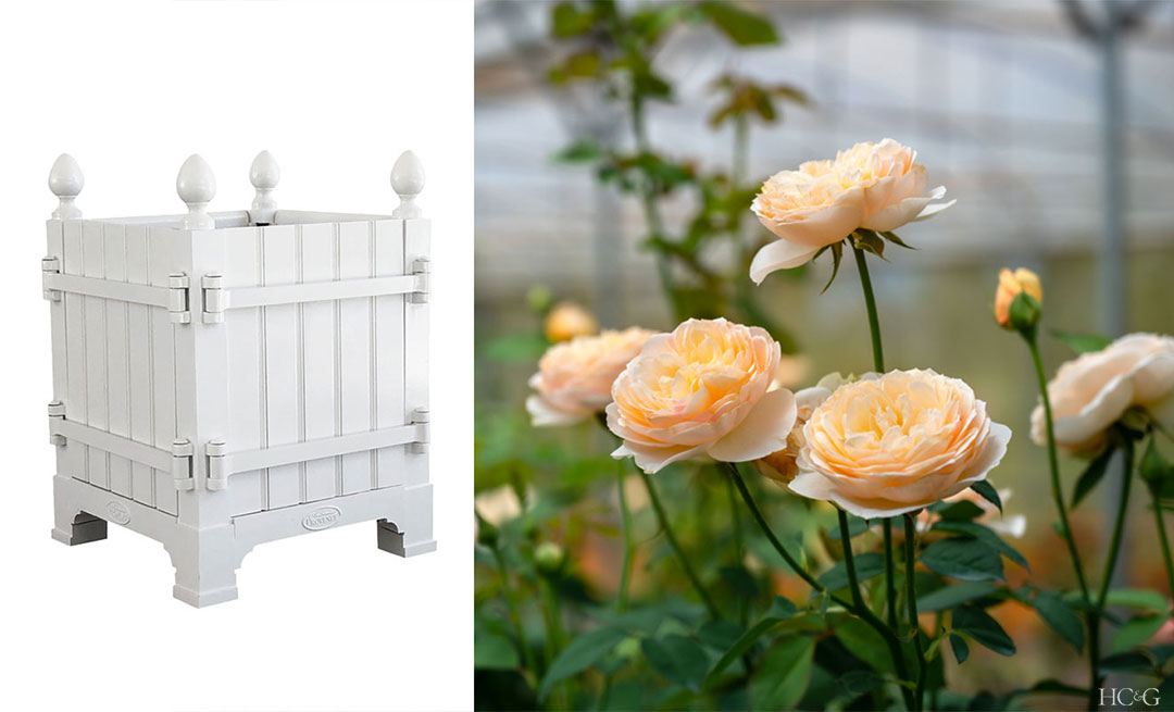 The caisse de Versailles may have been designed by André Le Nôtre for the citrus and palm tree collection of Louis XIV, but they work just as well for a big shrubby rose like the deliciously scented ‘Crown Princess Margareta’ from David Austin. If you’ve never grown roses, growing them in a pot is a good introduction.
