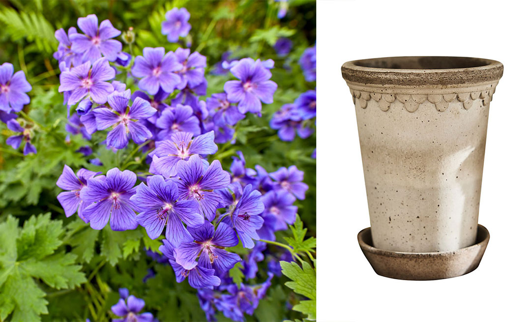 A clay pot doesn’t have to be boring. This beautifully detailed pot and saucer set is inspired by one manufactured at Denmark’s Fredensborg Palace around 1860. And, rather than the traditional red geranium (Pelargonium), try a perennial geranium like the ‘Rozanne’ cultivar that blooms until October. Bergs Tall Palace Pot + Saucer Set by Terrain.