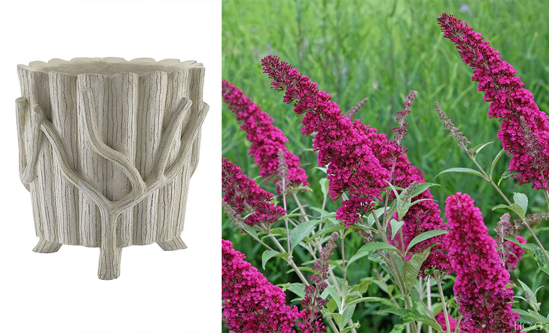 Buddleia, or butterfly bush, is a lovely match for this rustic, faux bois planter. Deadheading the plant all season long will reward you with blooms until autumn, as well as the multitude of butterflies it’s famous for attracting. Medium faux bois planter by Currey & Co., Mecox Gardens.
