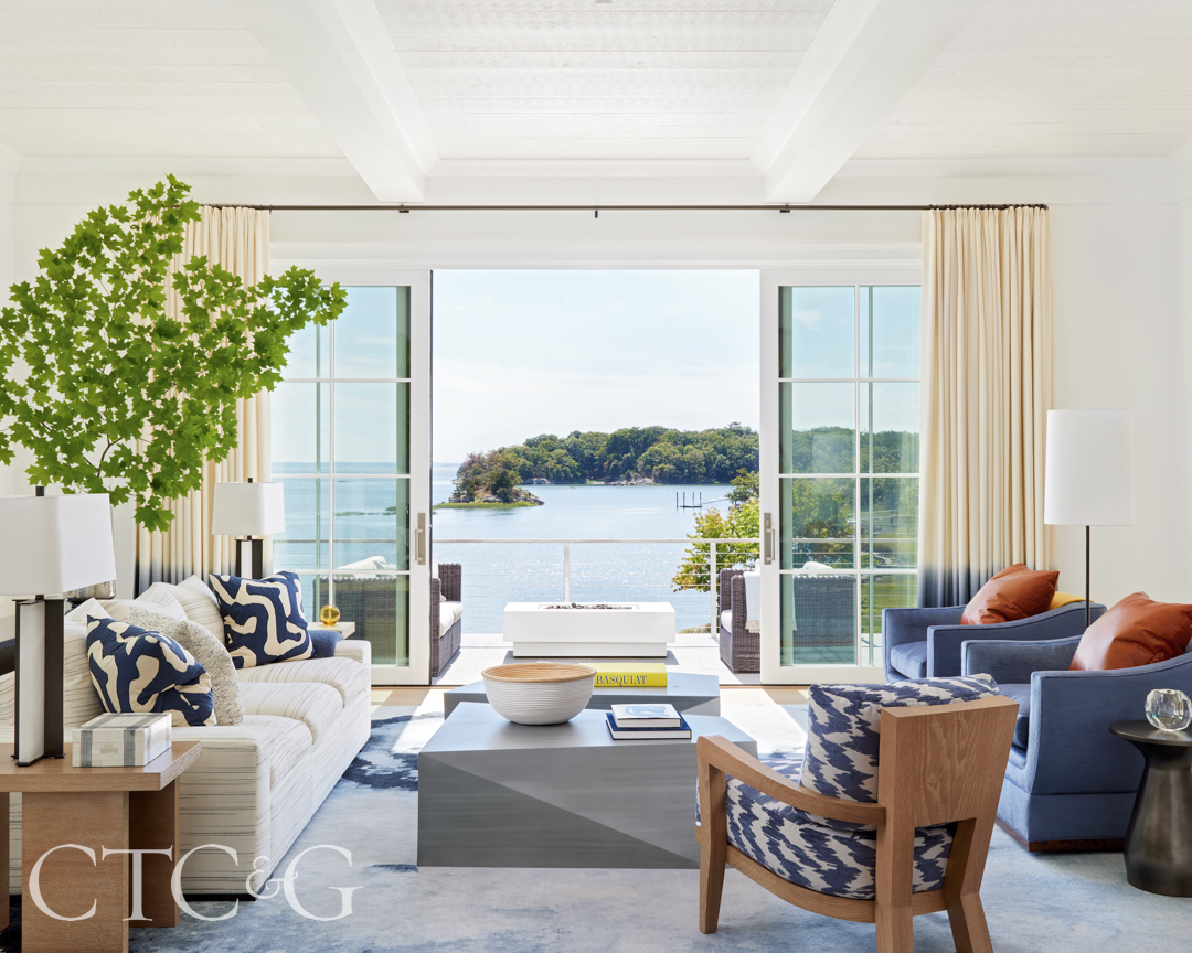 Dan Mazzarini, BHDM Design principal and creative director, designed this Connecticut home with its waterfront location in mind. “We took our inspiration from the views of Long Island Sound,” Mazzarini says. Outside, a fire pit adds warmth on cool evenings.