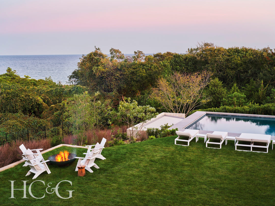 At a fashion executive’s North Fork property, landscape architect Jonathan Paetzel designed a yard with a swimming pool and outdoor entertaining area, which is complete with a fire pit and furnishings from Brown Jordan’s H Collection.