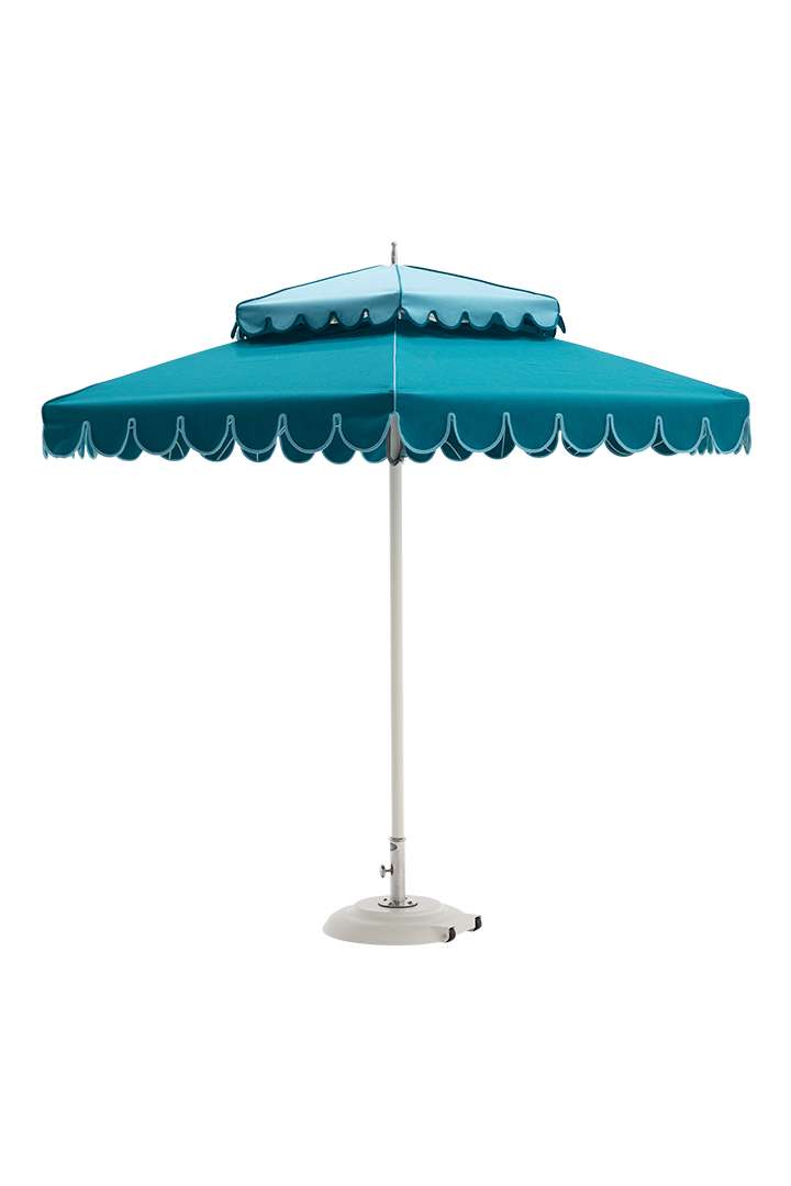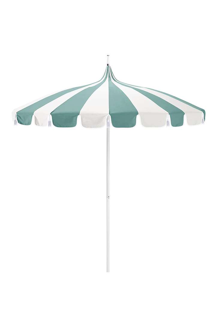 The Pagoda Dream House Umbrella in alternating aqua and white panels transports you to the Italian Riviera. California Umbrella.