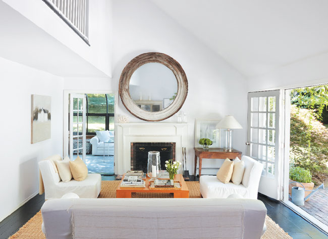 In the living room, a George Smith sofa is covered in a linen from Arabel Fabrics; the armless Halsey chairs are from Ralph Lauren Home. Foley had the circular window frame, a purchase from antiques dealer Liza Sherman, made into a mirror.
