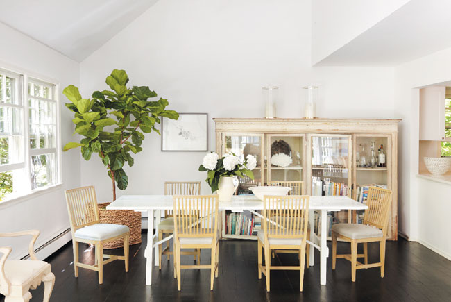 In the dining room, the table, chairs, and cabinet are all finds from Foley’s antiquing expeditions. The white Wedgwood bowl on the table is a gift from her sister, stylist and author Tricia Foley; the wicker planter is from Bloom.