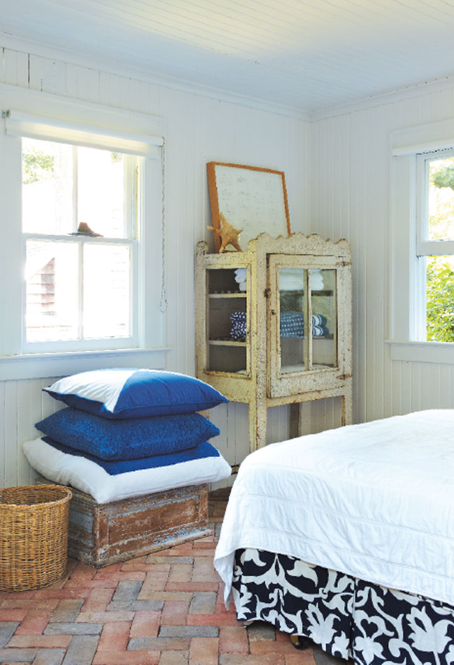 The bed linens and pillow fabric are from Ralph Lauren Home; the blue and white dust ruffle is from Williams-Sonoma Home. The chest and cabinet are finds from the Brimfield Antique Show.