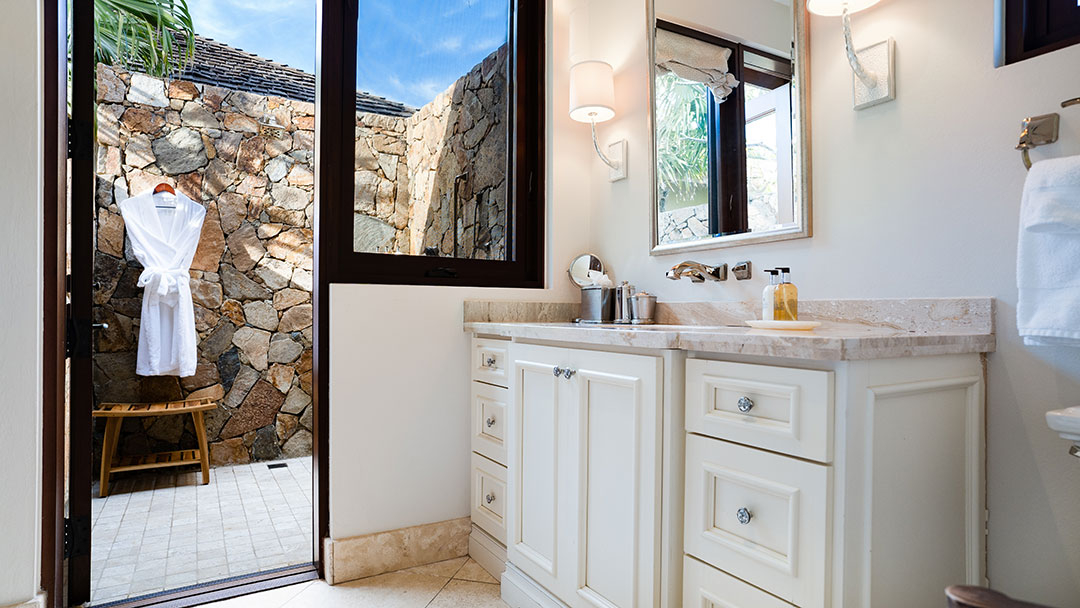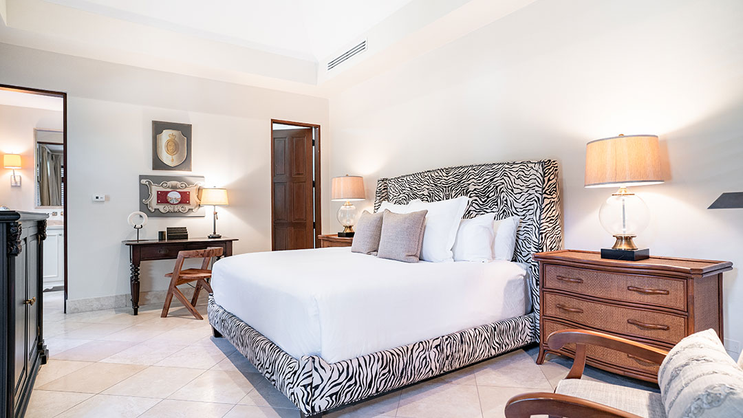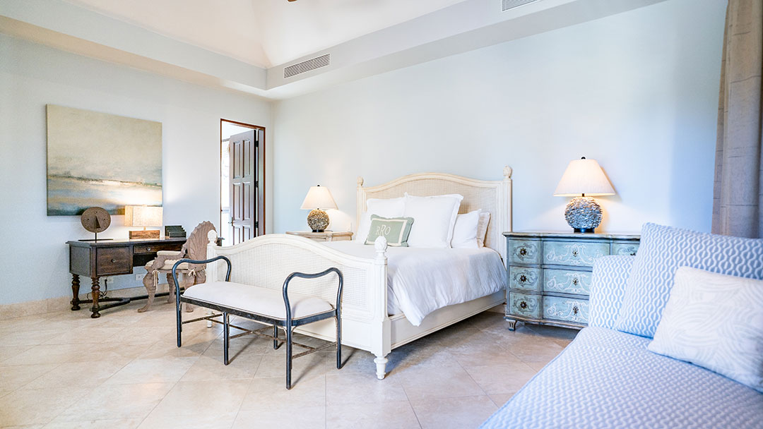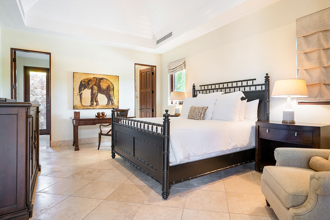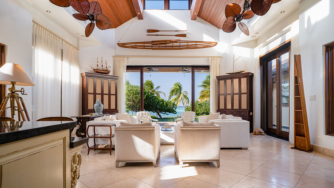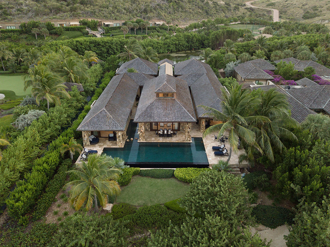 The 6,000-square-foot retreat sits among other impressive properties and is surrounded by the tropical beauty of Virgin Gorda. The floor plan includes six bedrooms, two of which are primary suites. The grounds feature an infinity pool, expansive patio, gardens, and incredible ocean views.
