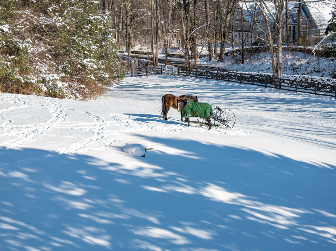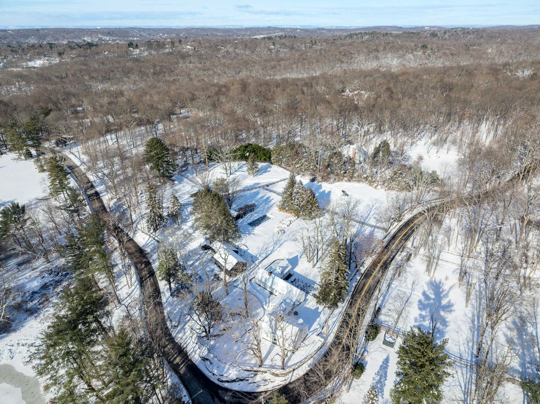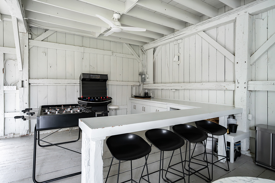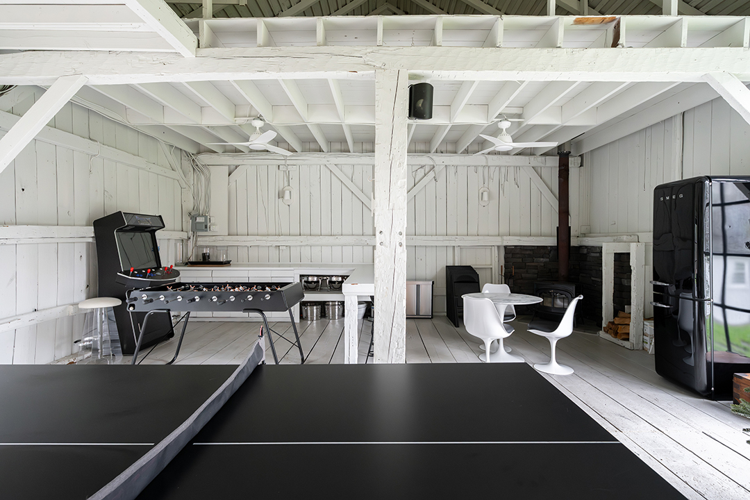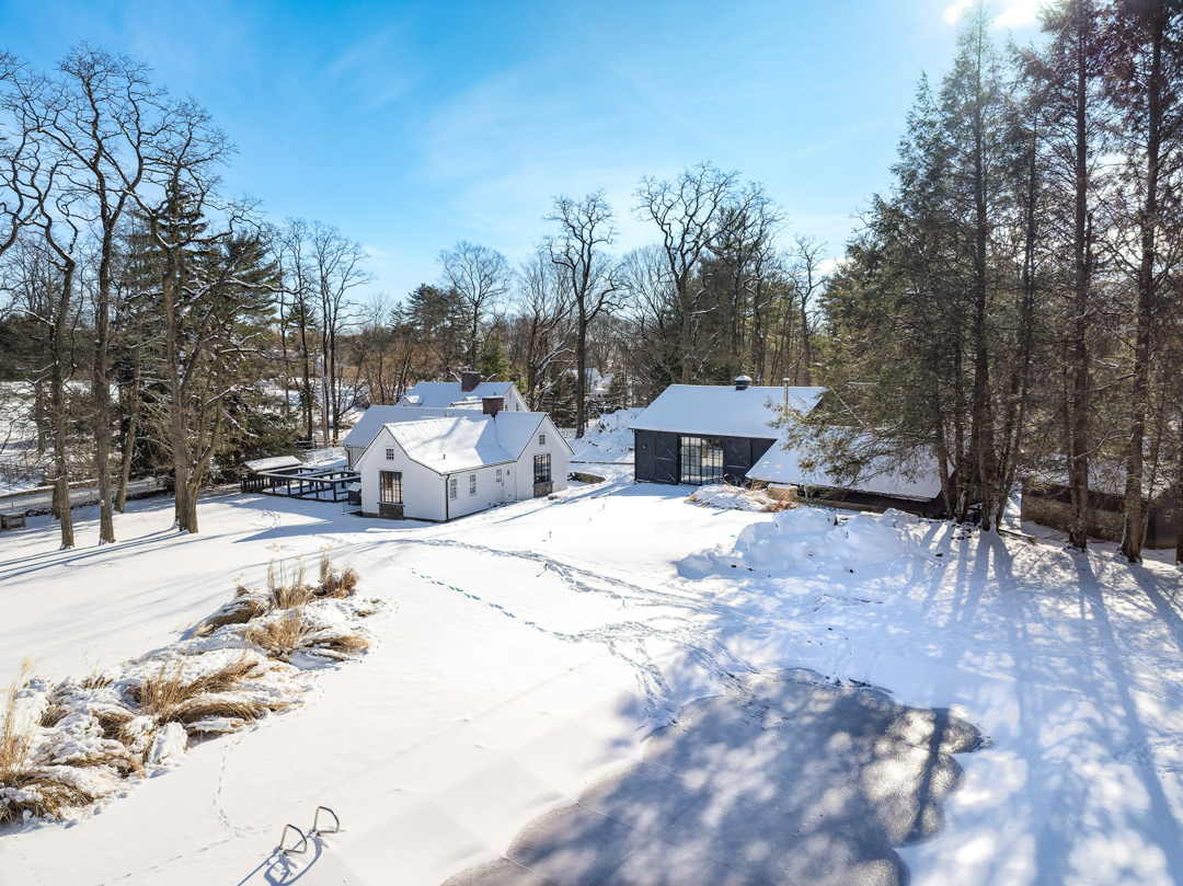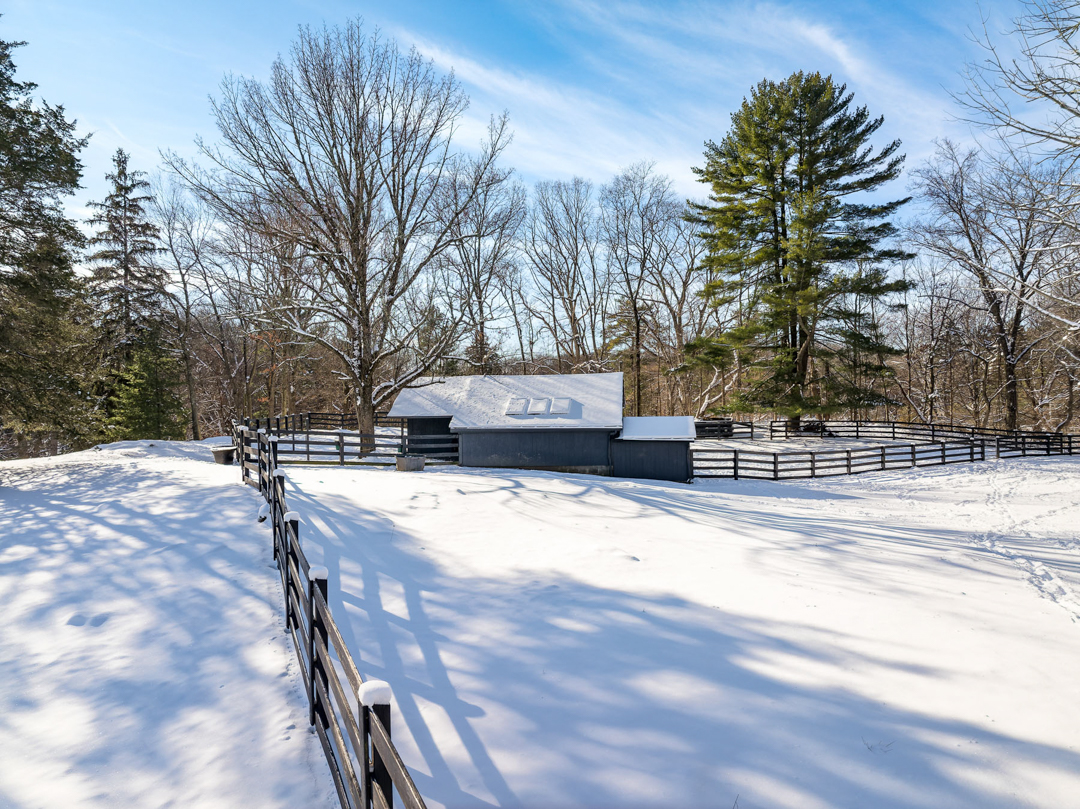 The grounds include a transformed party barn, a pool, a pool house with a kitchenette, three horse stalls with a tack room, and paddocks. Adjacent to protected conservation land and with direct access to the Greenwich Riding Trails, the listing is a peaceful escape set among nature. “Being the steward of this remarkable home and property has been a true privilege,” the couple says. “Our family has shared so many unforgettable moments here, from leisurely trail rides with our horses throughout the neighborhood to enchanting holiday celebrations in the historic barn.”