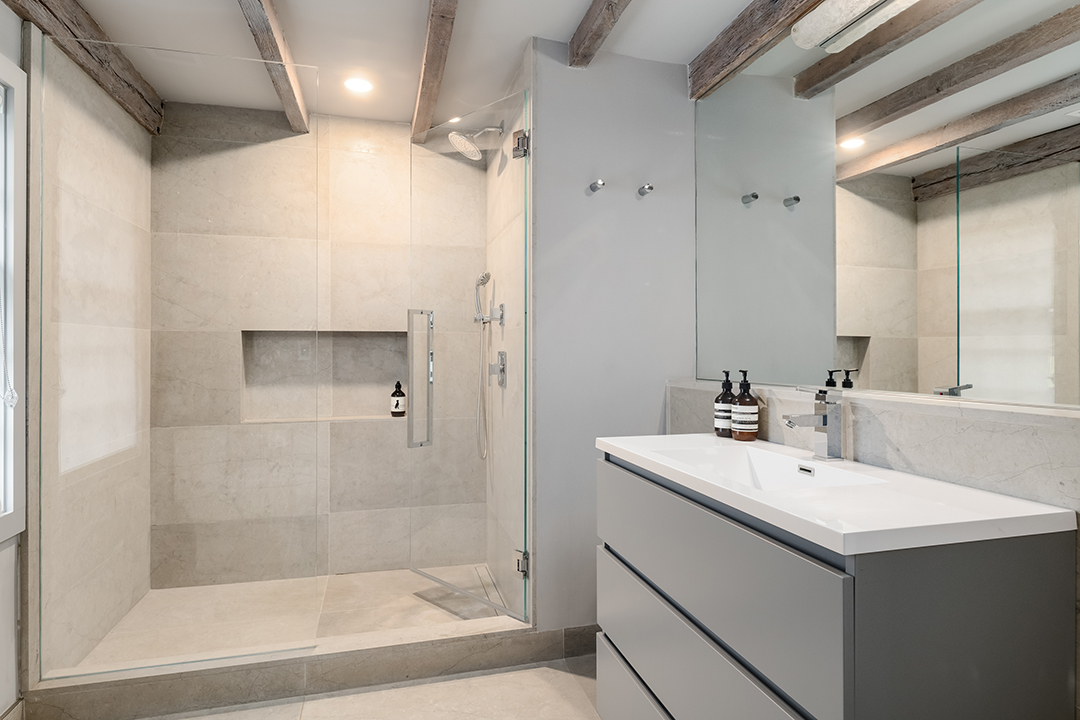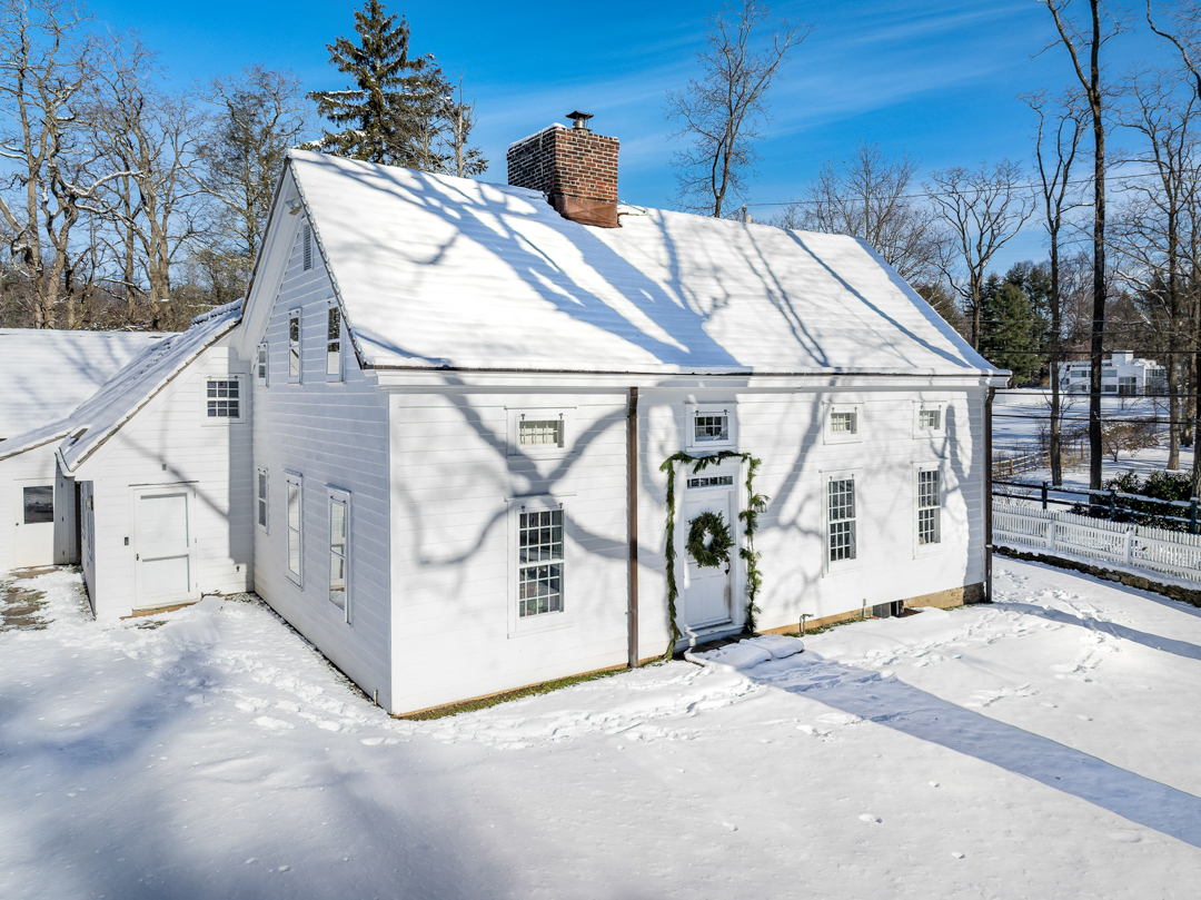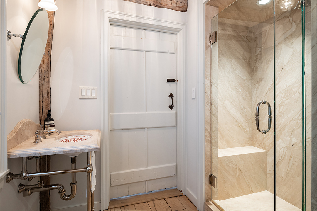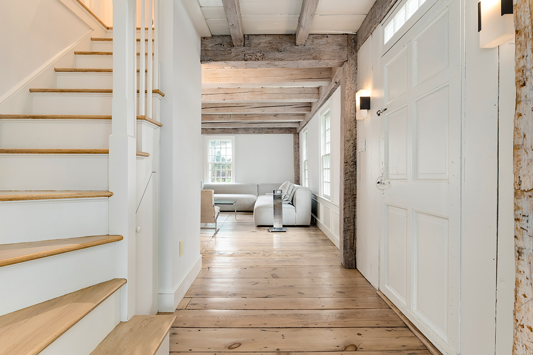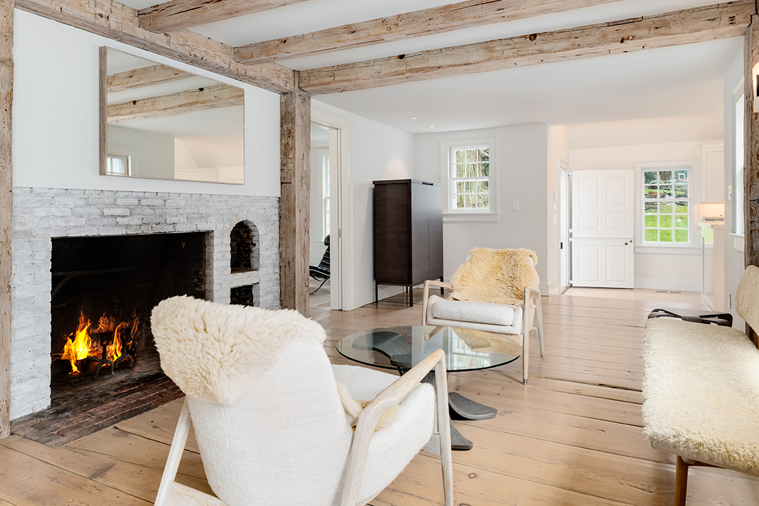 The four-acre farm dates back to 1725, was expanded in 1952, and was carefully renovated by the sellers recently with the help architect Sam Fitzgerald and John Desmond Builders. The main residence spans 3,669 square feet with six bedrooms and five bathrooms. Period details remain, including wide plank floors, exposed wood beams, and preserved fireplaces, while major updates like a contemporary white kitchen and chic bathrooms weave in modern luxury with ease.