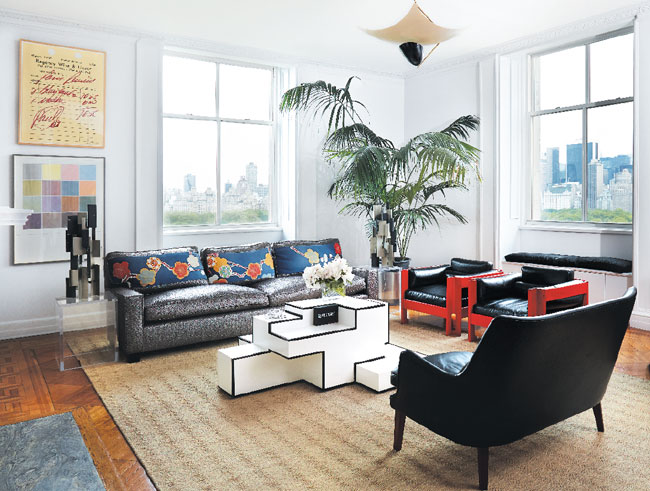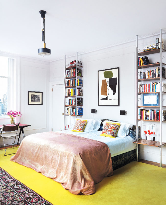 A chartreuse carpet from Stark appears here and in the master bedroom, where a Paris Review poster hangs above the bed and ikat accent pillows are trimmed in Jim Thompson’s Kaleidoscope in lemon. A Jim Zivic campaign chair from Ralph Pucci sits at the vintage Jean Prouvé Compas table.