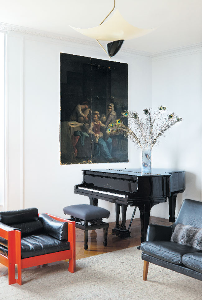The original wainscoting in the kitchen was painted black to coordinate with the Black Lace wallpaper from Trove. The schoolhouse chairs were found at a Paris flea market, as was the circa-1970s light fixture.
