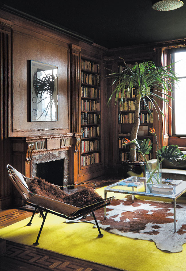 The library features a vintage leather club chair by Jean-Michel Frank and a mid-20th-century lounge chair by Hans Wegner; the Lucite coffee table is from Plexi-Craft.