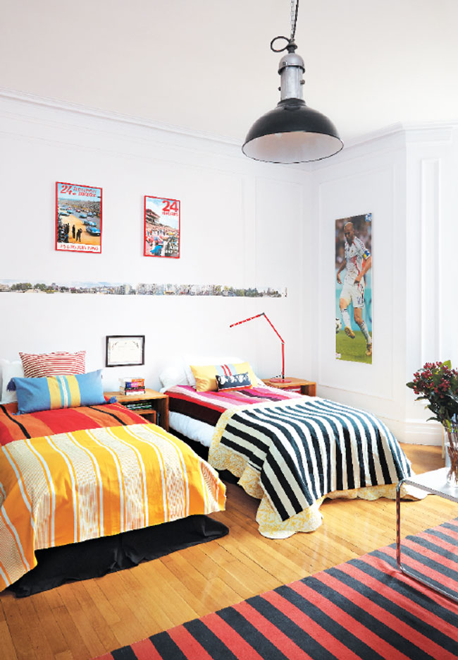 Son Nico’s room includes colorful striped fabrics collected by Hunnewell over the years and a striped rug from the Conran Shop in Paris; the George Smith club chair is covered in an Indian-print fabric.