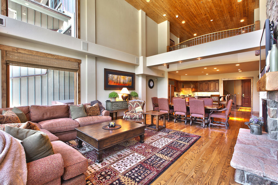 The residence is a two-story condo at the Black Diamond Lodge and features panoramic views of Deer Valley Resort through floor-to-ceiling windows. There are 4 bedrooms and a total of 3,759 square feet of living space along with multiple balconies, a spacious open kitchen and a wood-burning fireplace.