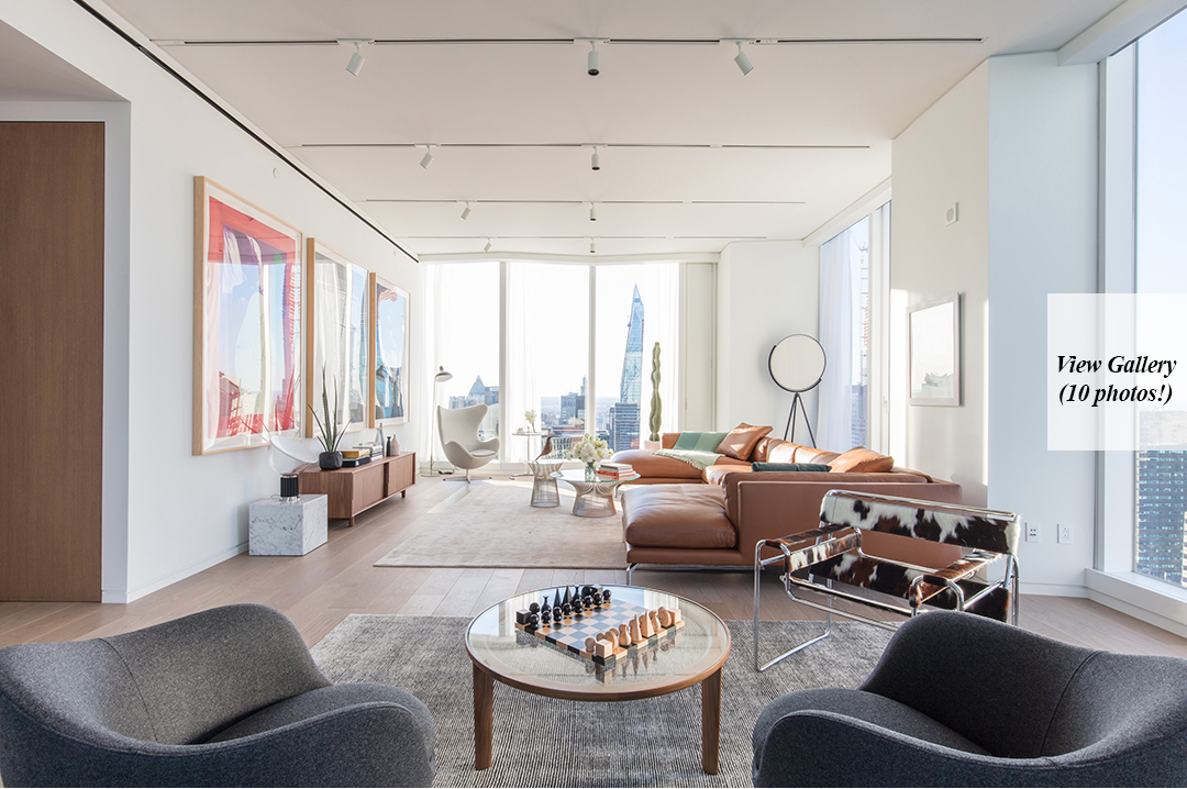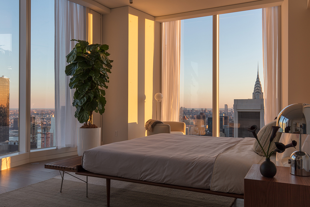 Owning a full-floor spread in a Manhattan high-rise is a privilege bolstered by the guarantee of 360-degree views of the city and near-uninfringeable privacy and made exclusive by their exclusivity, scale, and resultant price tag. A Midtown modernist tower, One Hundred East Fifty Third Street, has just added eleven such spaces to the ever-competitive real estate pool—located from the 49th to the 59th floors, the condos each span 3,385-square-feet. They start at $10 million.The building itself is brand new, designed by firm Foster + Partners and completely contemporary. Unlike most new builds, One Hundred East Fifty Third Street was crafted with the intention of providing a diverse array of living spaces— studio and one-bedroom units lie just floors away to allow for a range of lifestyles. The latest unveil in this slate, the full-floor units are also, of course their most elite. Each encompasses three bedrooms, three bathrooms, and a powder room, with direct elevator access.The elevator does not open directly into the apartment, however; for utmost security, a custom keyed rift cut white oak door guards the apartment, behind which lies an entry gallery outfitted with further custom woodwork. Floor-to-ceiling windows throughout the kitchen, living and dining rooms offer exposure to the East, West, and North (including Central Park), with the former outfitted with brushed oak cabinets and soaked in Carrara marble.One Hundred East Fifty Third operates practically as a luxury hotel; concierge services, restaurants, a private gym and spa are all amongst the amenities. The third and fourth floors are swallowed by the Private Residents; Club, complete with a 60-foot pool and sauna. For more information, visit the building’s website.