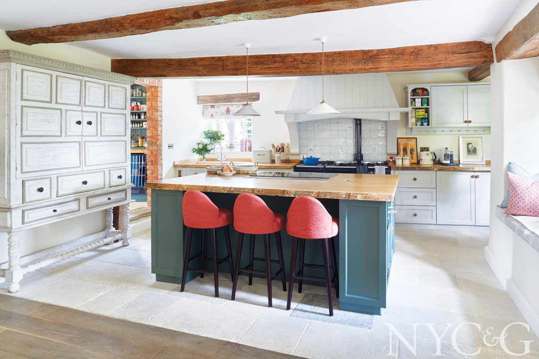The kitchen features oak countertops, Hector Finch pendant lights, and barstools covered in a fabric from the Bart Halpern Textile Collection.