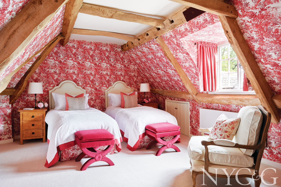 In a guest bedroom, existing oak beams anchor a custom 18th-century-motif toile wall covering and bedskirt fabric. The twin beds are covered in an antique French bedspread, which was cut in two and trimmed in James Hare’s Orissa silk in Geranium Pink. The benches are upholstered in Élitis’s Alter Ego velvet.