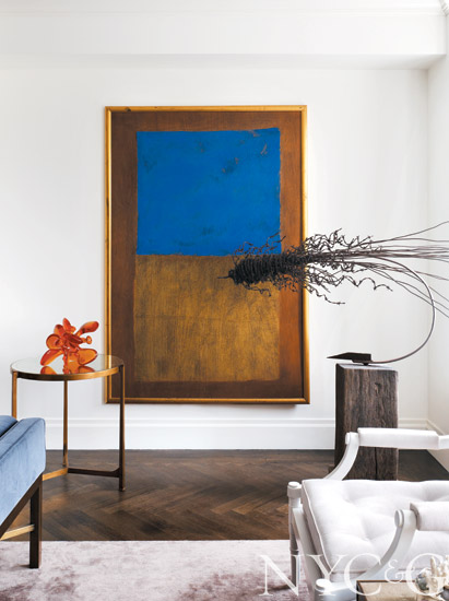 Artworks in the living room include a painting by Den Allard and a twisted metal sculpture by decorator Mark Zeff.
