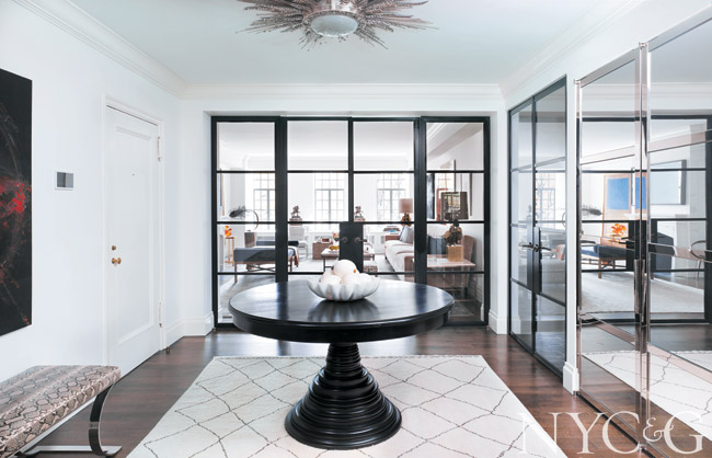Installed glass and metal folding doors that separate the foyer from both the living room and the dining room, which features an antique-mirror wall and a faux leather door. The chairs surrounding the Corbusier table are reupholstered in Scalamandré’s Paddington Velvet.