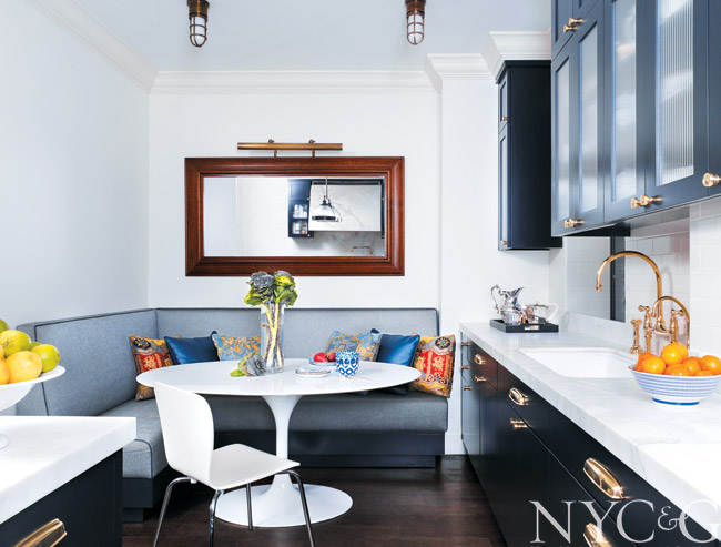 The cushions on the banquette are upholstered in Architex fabric and leather piping from Samuel & Sons; the table is from Maxwell Blake.