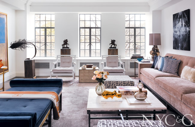 The Zeff-designed sofa is covered in Kravet’s Venetian Dusk; the Bespoke Furniture daybed is upholstered in a Designers Guild velvet and accented with an Hermès throw. The chairs positioned against the window are vintage John Hutton designs.