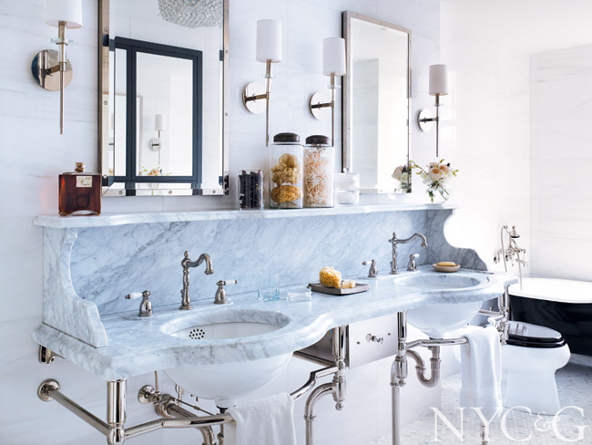 The master bath features a claw-foot tub and a double-sink, Carrara-marble vanity from Urban Archaeology.