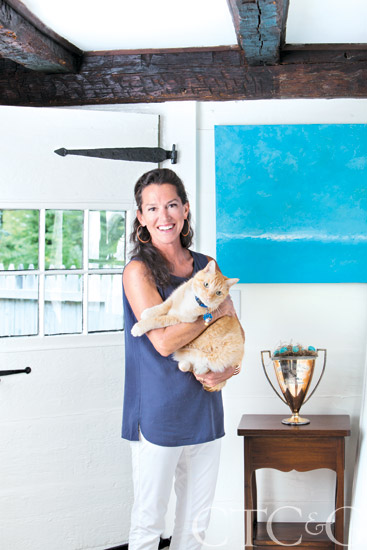 Here, the designer poses with her cat, Doggie, in the foyer.
