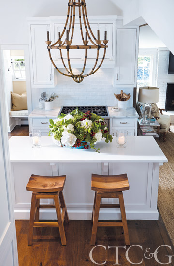 A Currey & Co. bamboo chandelier picks up the brown of the custom oak floors. White Caesarstone tops the island, while the counters are done in Carrera gold marble. Floral arrangements are by KD&J Botanica. Backsplash subway tile is through New England