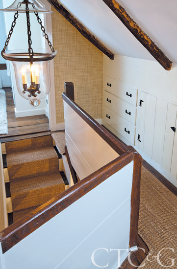 A Phillip Jeffries grasscloth wall covering and a hemp rug add contemporary punch to the second-floor hallway. The glass bell lantern is from Visual Comfort