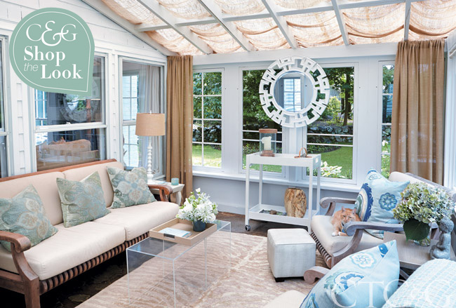 In the three-season room, windows and ceiling are dressed in burlap. The teak couch and chairs are from Barlow Tyrie, the rolling bar cart is from Jonathan Adler.