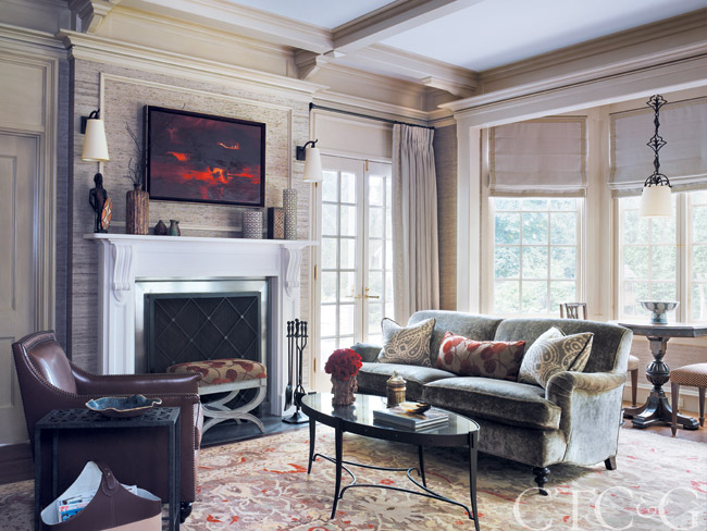 The den’s custom sofa sports a velvet through Lee Jofa; the owner’s game table chairs were redone in a Brunschwig & Fils fabric, the carved limestone fireplace and metal surround are from Chesney’s of London; the bronze sconces and the light over the game table are from Objet Insolite. The Michael Smith leather club chair is through John Rosselli.