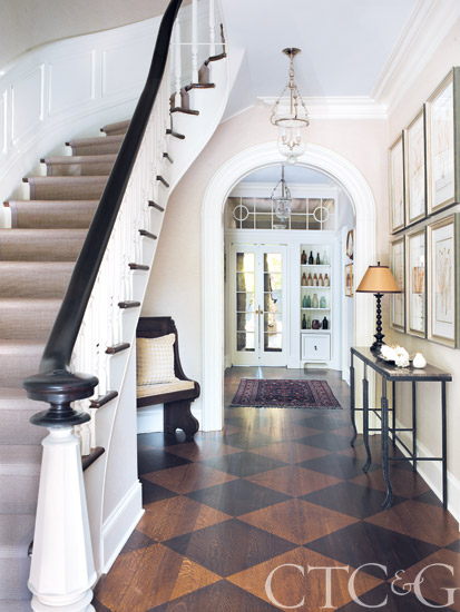 In the foyer, the painted floor leads to the family room, where bottles unearthed from the excavation are displayed. A Turabian & Sariyan sisal covers the stairs. The glass ceiling lanterns are from the Fashion Light Center. The metal console is from Saladino Furniture. Vintage botanical prints are from the George Glazer Gallery.