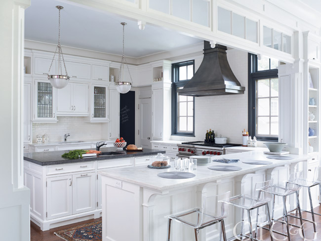 Vaughan fixtures hang above the island, which is topped with a Petit Granite corduroy-edged French limestone from ABC Worldwide Stone. The custom stainless steel hood is through Danbury Sheet Metal.