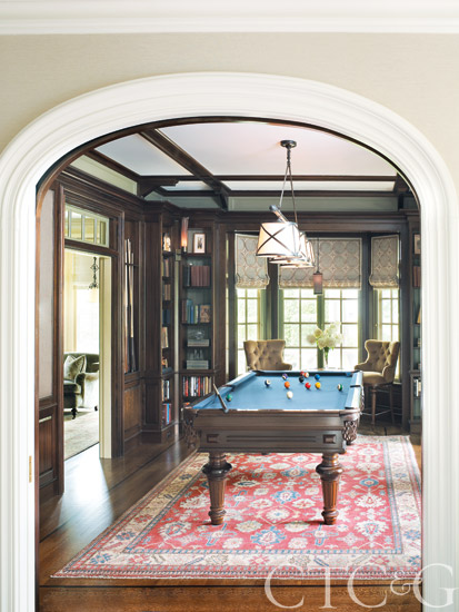 In the billiards room, chairs from Century Furniture are covered in a Robert Allen cashmina. The light over the game table is by Visual Comfort. Embroidered linen shades are from Zimmer+Rohde; linen wall paneling is through John Rosselli.
