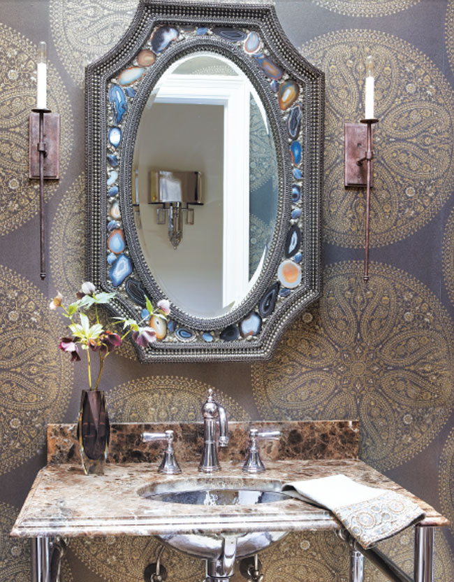 The powder room features Zoffany’s Paisley Circles wallpaper. The mirror, through Safavieh, is composed of cut stones and complements the brown marble sink.
