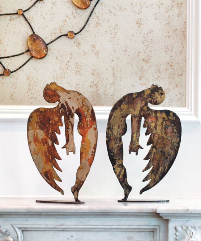 The owners found a pair of metal Art Deco angels in South Africa. Textured foil wall covering above mantel is through Winfield Thybony Design.