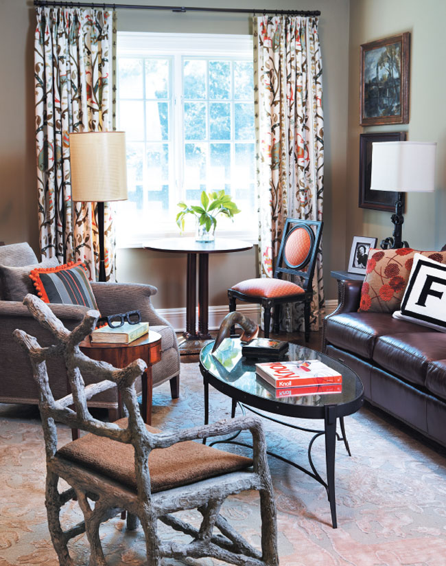 In the library, a Holly Hunt twig chair and a Ferguson Copeland sofa flank an Avrett coffee table from Michael Taylor. Drapes made of Nina Campbell’s Beatrice fabric through Osborne & Little are trimmed in Samuel & Sons French grosgrain ribbon Bayleaf. Initial sofa pillow is through Jonathan Adler. Rug is through Stark Carpet.