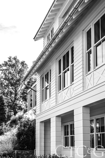 Barely imperceptible just below the windows is a subtle reference to crossed porch railings incorporated by the architect in homage to the local vernacular.