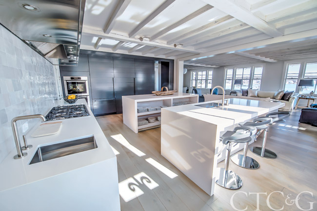 Custom kitchen cabinets through Custom Furniture & Design include open shelving and Miele appliances integrated behind panels. The engineered wood floors are from Exquisite Surfaces. ; the backsplash is made of French hand-cut tiles.
