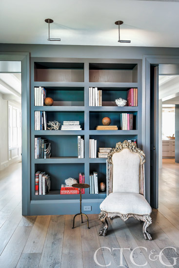 In the library, a custom sofa wears a Holly Hunt mohair fabric; sofa pillows are through Bungalow; chaise sofa is covered in a Rogers & Goffigon.