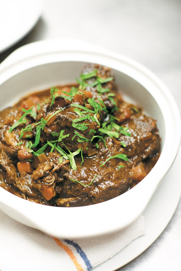 An authentic taste of Italy: Braised short ribs of beef from the butcher at Tarry Market are slow-cooked with a hearty Barolo wine.