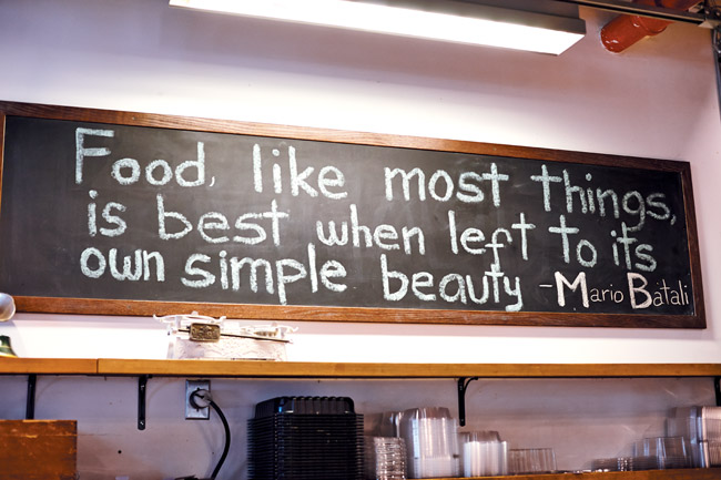 Mario Batali’s food philosophy is framed and hangs on a wall in Tarry Market.