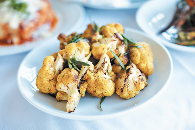 A side dish of organic roasted cauliflower is garnished with fresh rosemary sprigs.