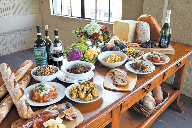 Ceci salad, Brasato al Barolo, rigatoni with butternut squash and sage, marinated olives. Bottom row: Lasagne Bolognese, roasted cauliflower, succulent and crispy Porchetta, cider-glazed carrots, and of course, meatballs. Selected wines: La Mozza Morellino di Scansano 2012, Brandini Barolo 2008, Brandini Moscato d’Asti 2013, Flor Prosecco.