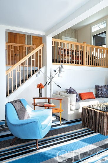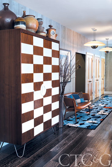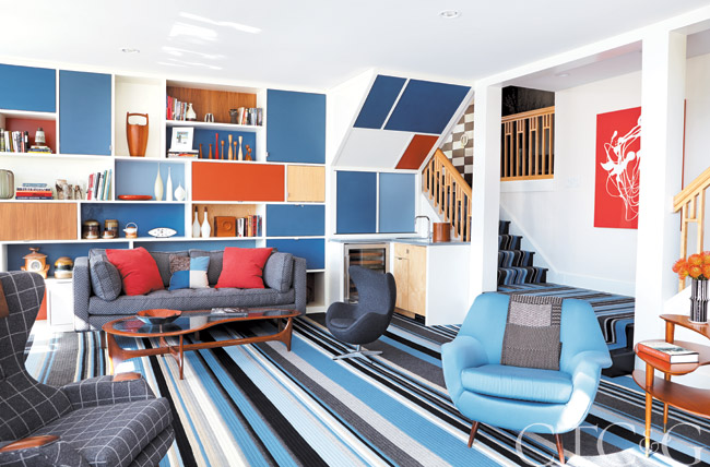 A wall of custom cabinetry in the living room evokes Mondrian canvases. A custom sofa, covered in a chevron pattern from Schumacher, is complemented by an Adrian Pearsall chair in another Schumacher fabric. The sculptural lounge chair upholstered in a Schumacher cerulean wool satin is through Oliver Modern. Throw is through the Linen Shop.