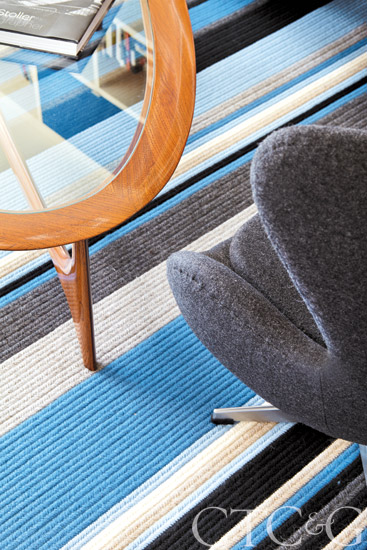 In the living room, an Arne Jacobsen Egg chair from Home Nature and a vintage coffee table through Gary Rubenstein Antiques are right at home on a boldly striped wool Beauvais rug.