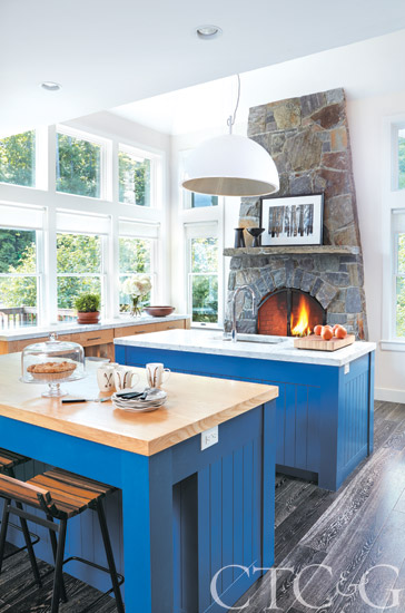 A Tomas Frenes light fixture is suspended above one of the kitchen islands, where Thomas Hayes barstools provide extra seating.